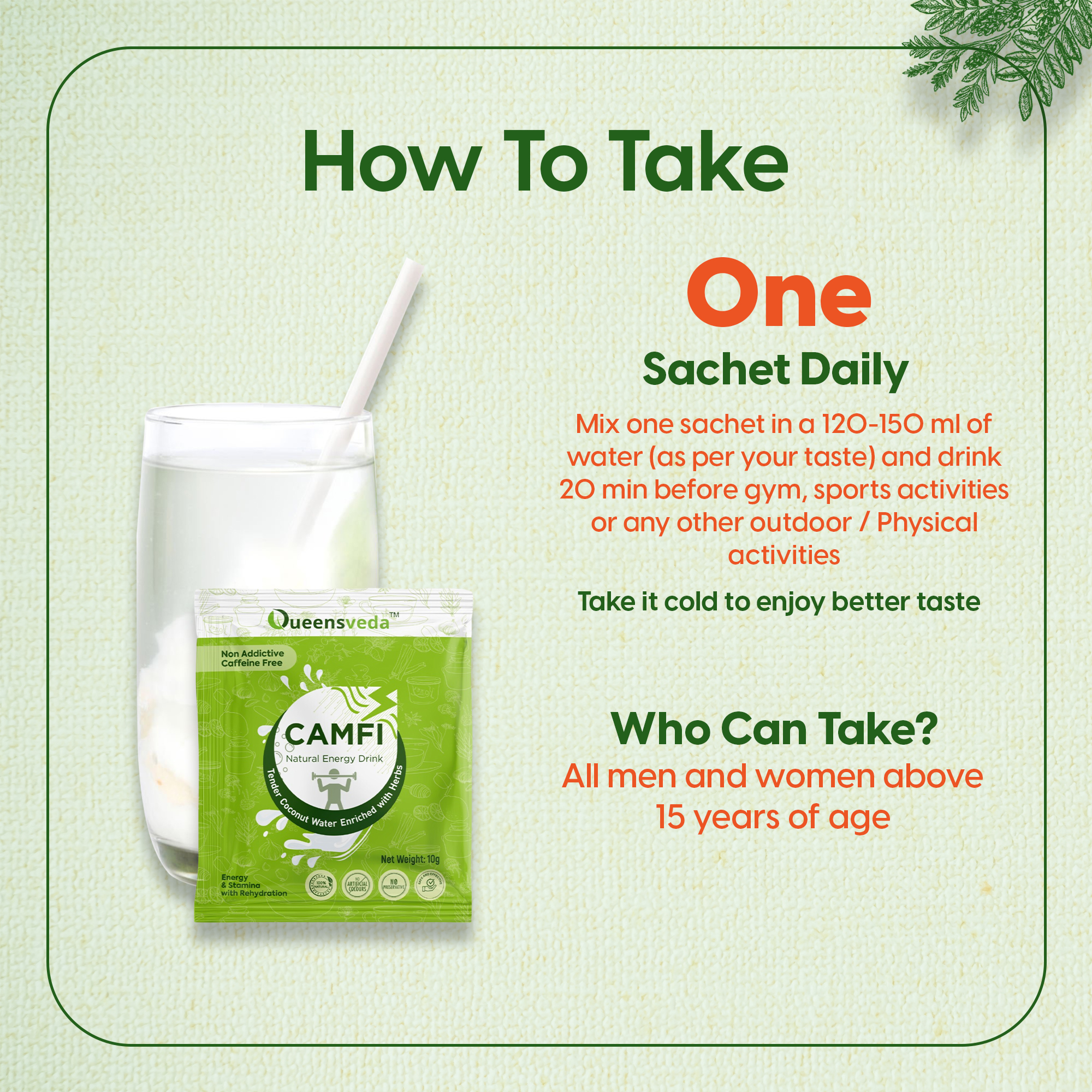 Camfi – The Natural Energy cum Stamina Drink Prepared with Tender Coconut Water (Caffeine Free) | Pack of 15 Sachet