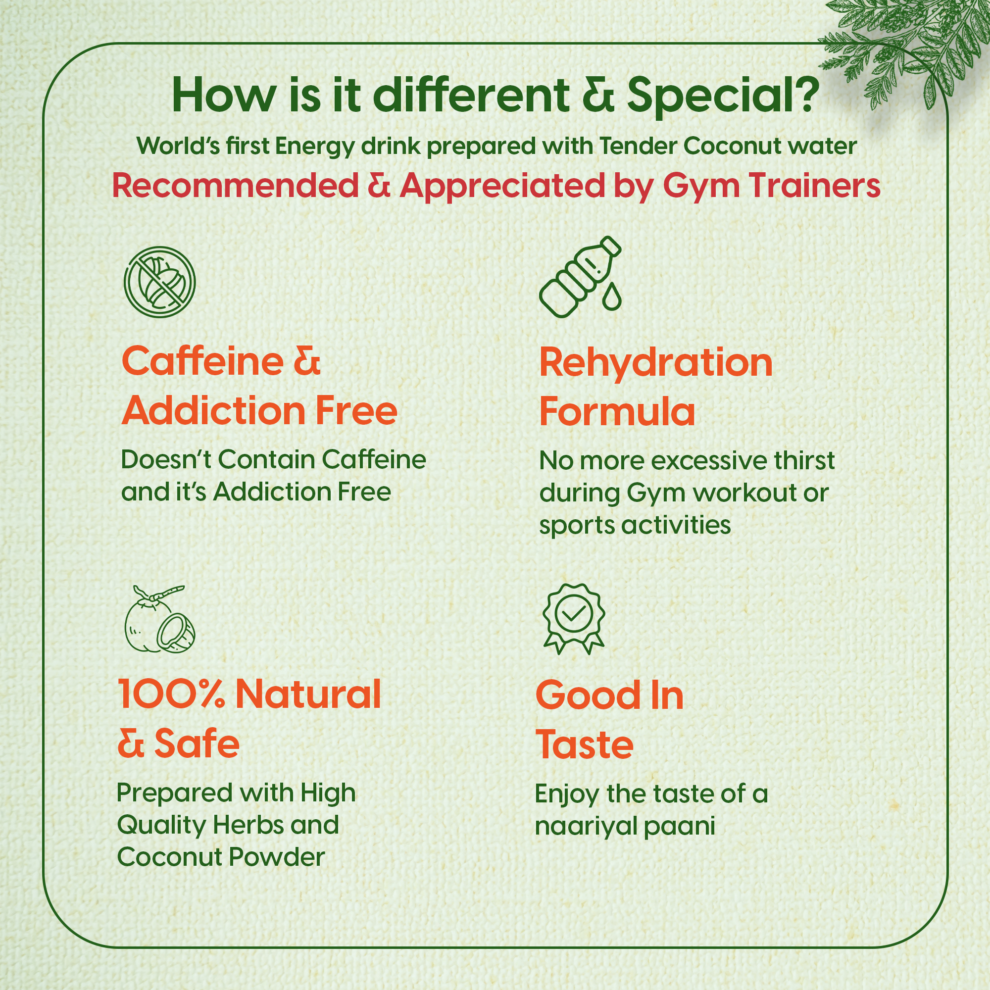 World’s first Natural & Caffeine Free Energy & Stamina Drink prepared from “Tender Coconut Water”- Designed in India for the world!