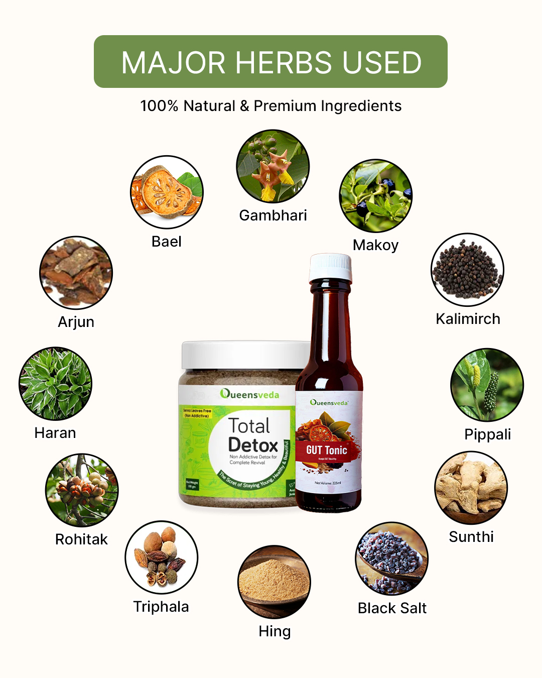 1.Total Detox (Combination of 12+ herbs): Helps in Indigestion, Constipation, Natural Bowel Movement, Clear your waste in single time. Total 1 unit (100 gm)