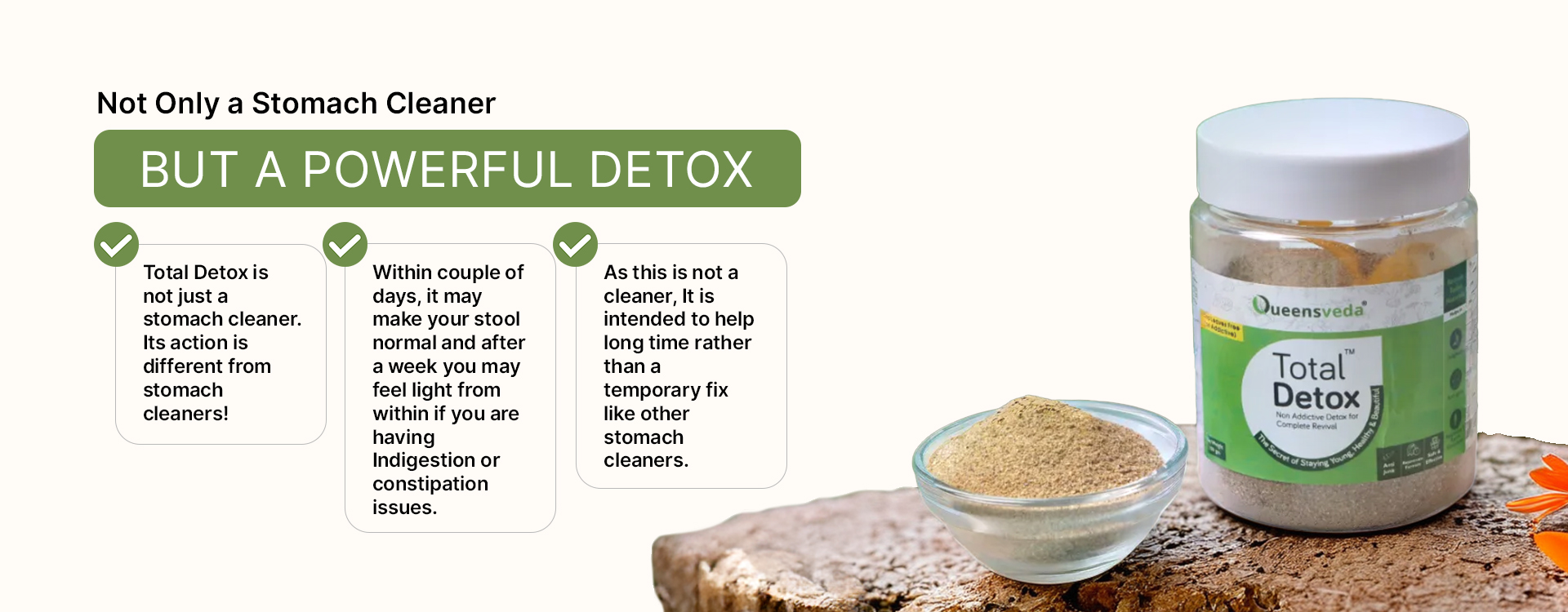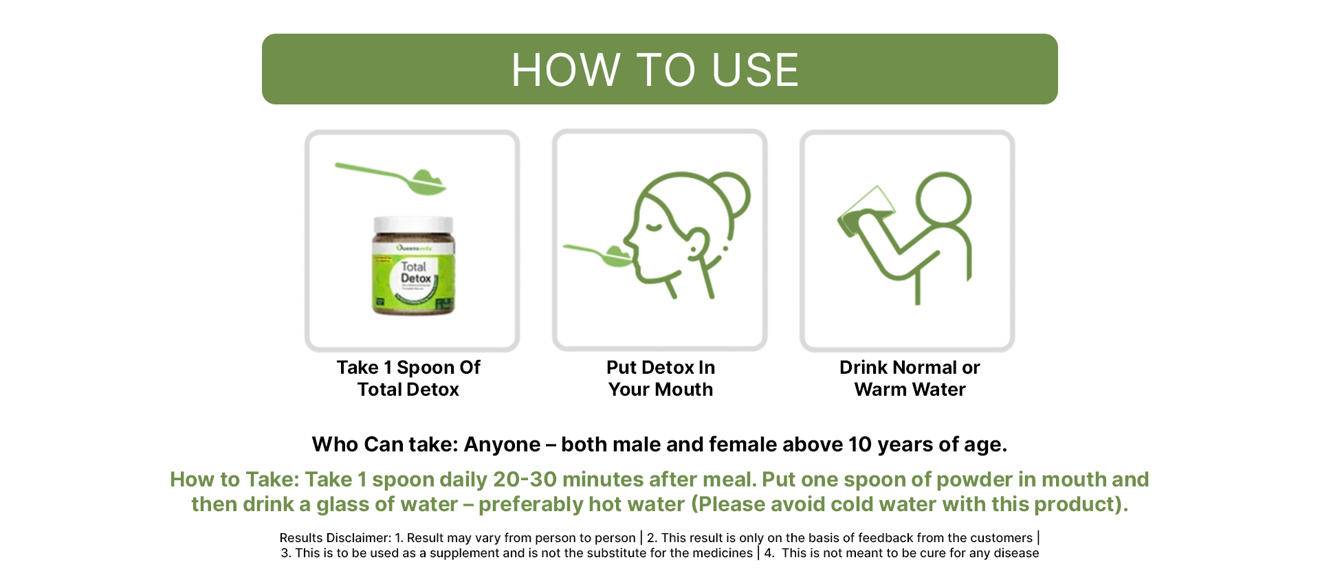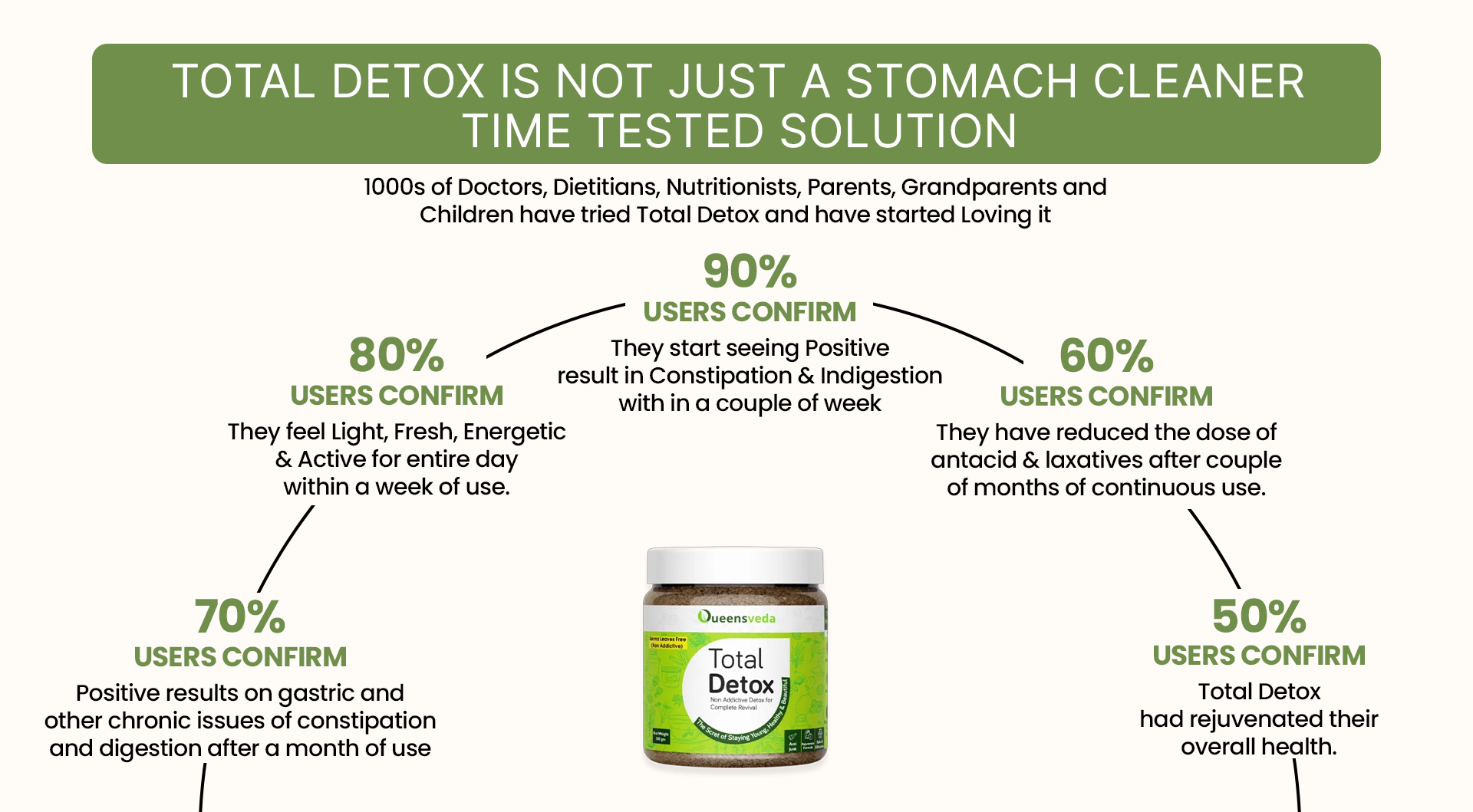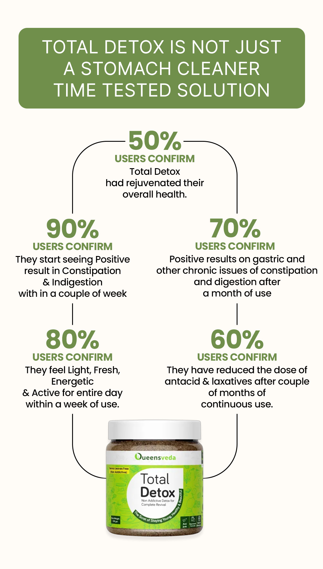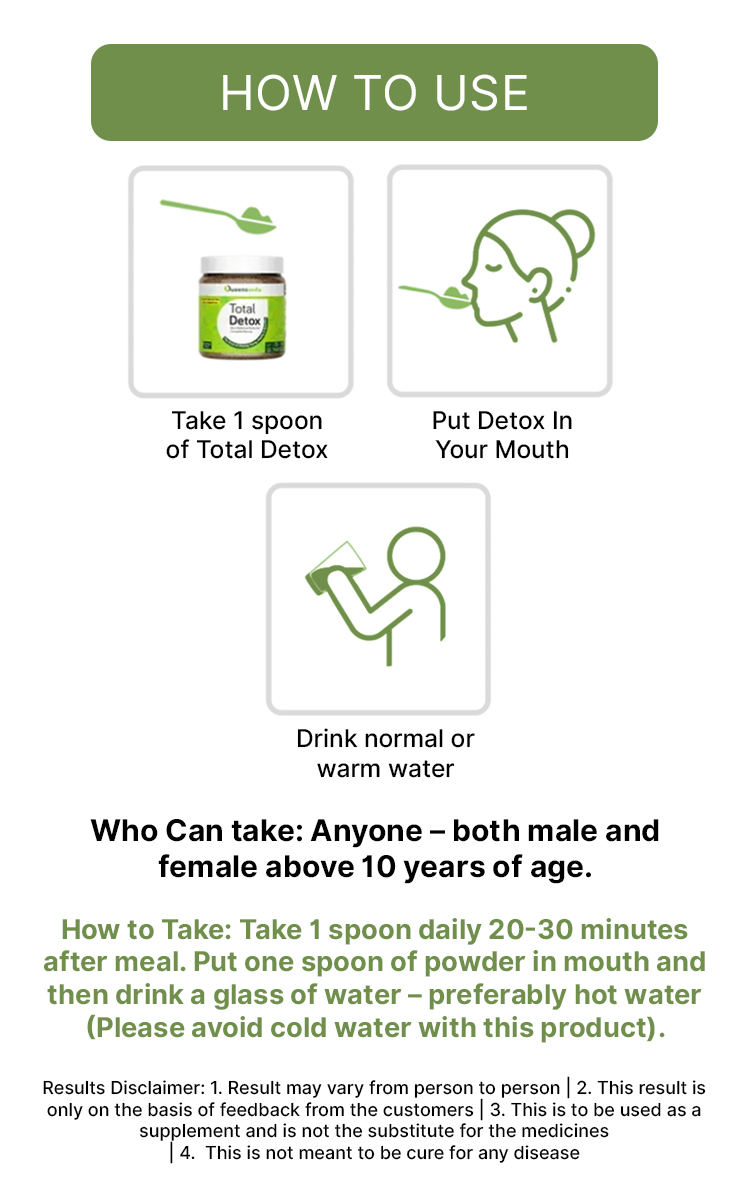 Total Detox helps in Digestion, and once the food is digested, it helps in removal of the waste. That’s why You may feel light, fresh and active daily after taking it in the previous night.